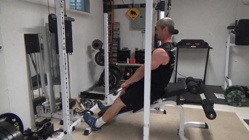 Now "deadlift" the weight up and get into the top position...this first part is just to get into position for the actual set. Once you're in the top position, make sure your body position and feet are good. Your heels should be braced on the feet of the bench.