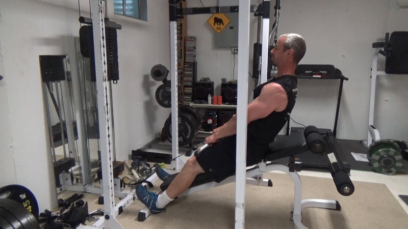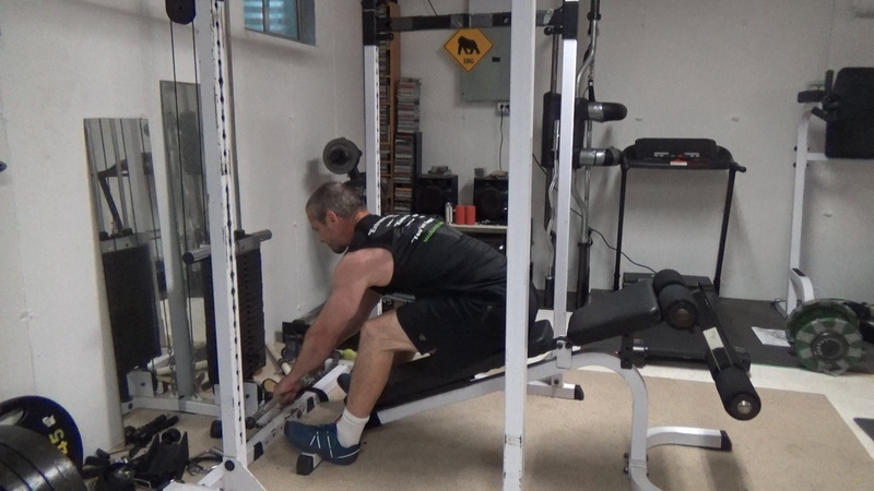 Now "deadlift" the weight up and get into the top position...this first part is just to get into position for the actual set. Once you're in the top position, make sure your body position and feet are good. Your heels should be braced on the feet of the bench.