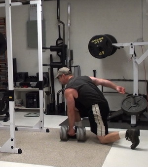 First, set the dumbbell on the floor between your legs (I'm using a 105 lb dumbbell for this one). Pick it up with both hands on the handle then set it on your thigh.